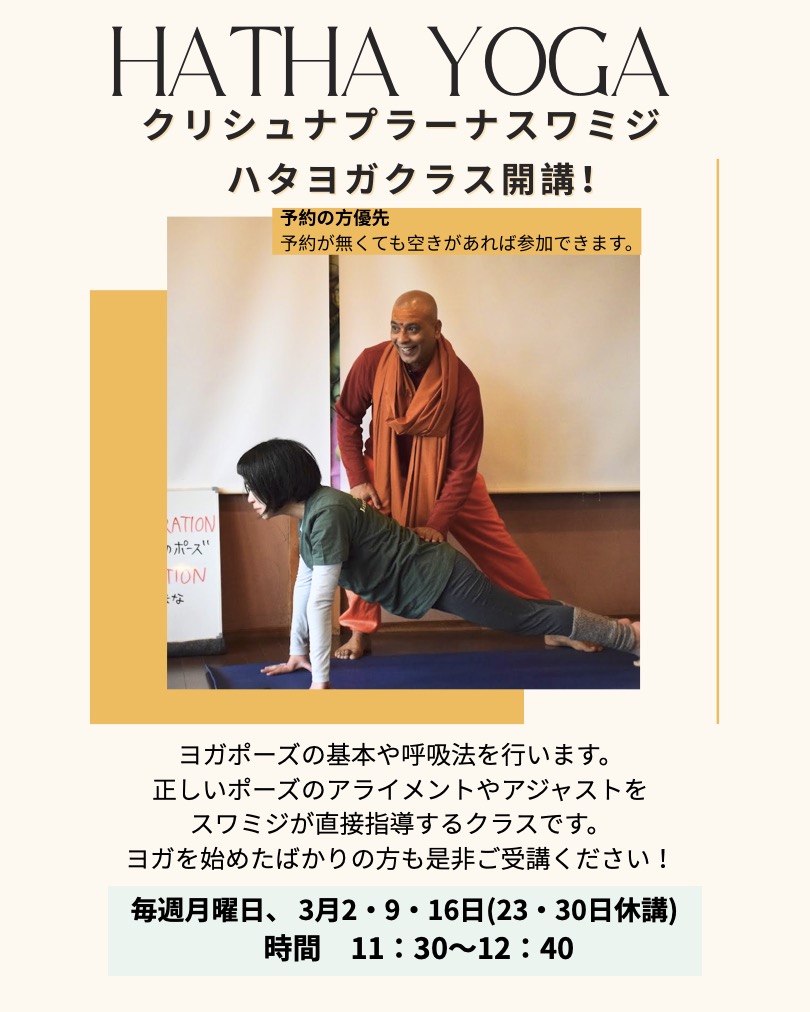 3月は、県外で活躍しているスワミジの愛弟子がクラスを担当してくれます。